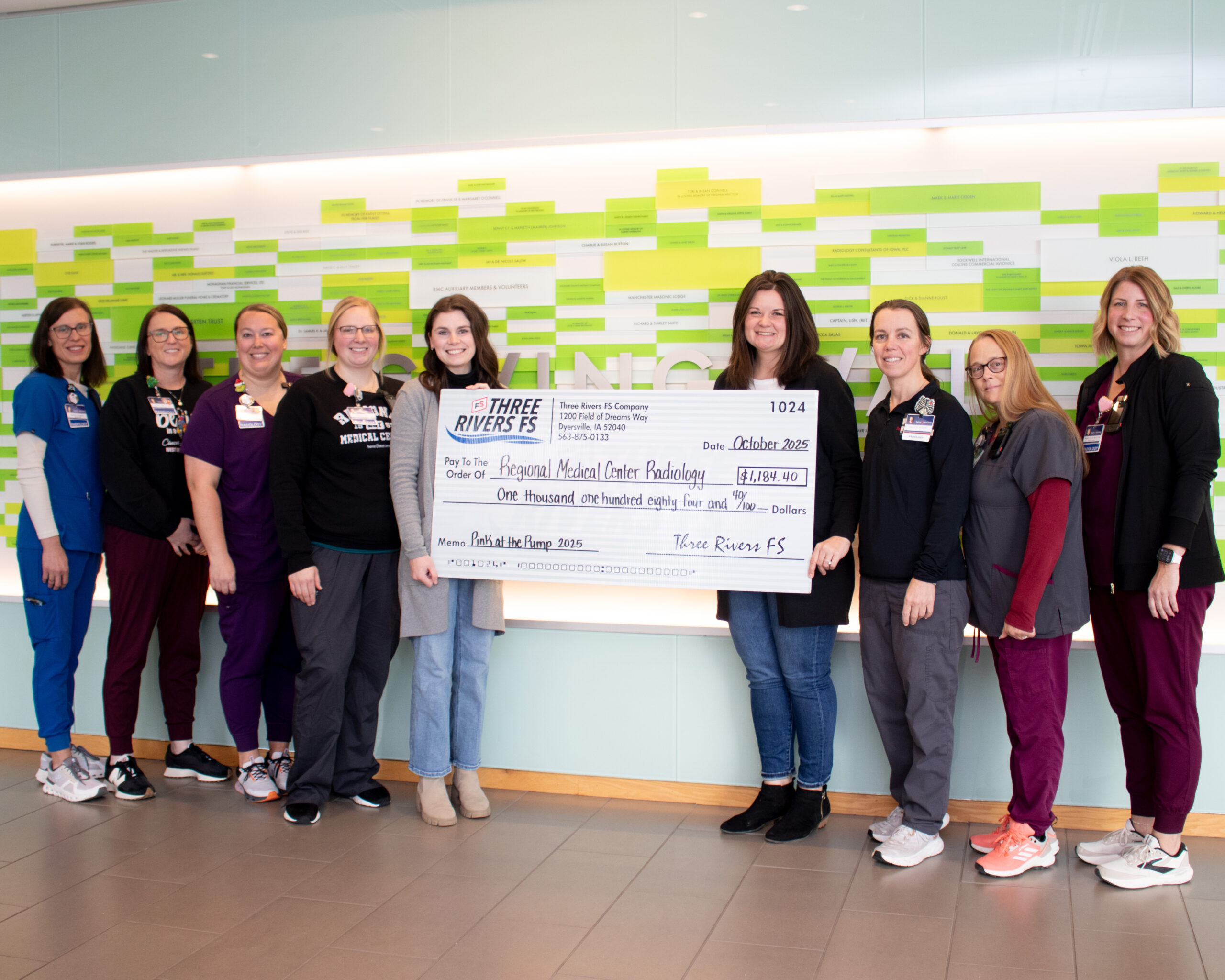 Three Rivers FS presented a check of $1,184.40 to Regional Medical Center (RMC) Radiology Department in support of their “Pink Support Bag” fund used to provide items of comfort to newly diagnosed breast cancer patients.